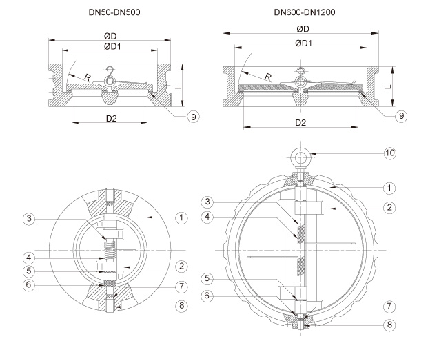 | 编号 | 零件名称 | 材质 | | 1 | 阀体 | WCB, CF8, CF8M | | 2 | 阀板 | CF8, CF8M | | 3 | 阀轴 | SS304, SS316 | | 4 | 弹簧 | SS301, SS321 | | 5 | 轴承 | 橡胶阀座:PTFE, 金属阀座:SS316 | | 6 | 轴承 | 橡胶阀座:PTFE, 金属阀座:SS316 | | 7 | O型密封圈 | 和橡胶阀座一样, 金属阀座:石墨 | | 8 | 六角螺栓 | SS304, SS316 | | 9 | 阀座 | NBR, EPDM, FPM, 金属阀座 | | 10 | 吊环螺栓 | SS304, SS316 |